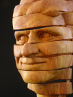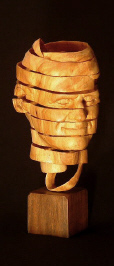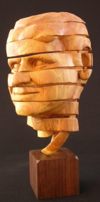 | "Immortality" is a man's bust presented as a never ending loop of ribbon. One could say that this sculpture is an expression of eternal optimism. Life will go on. Mankind will survive either by good luck or, preferably, by good management. For my friend Graham Ide, this sculpture, created from a piece of his willow tree damaged during eastern Ontario's infamous 1998 ice storm, may have personal significance. "Immortality" is carved from willow with black walnut base; approximately three quarters life size. 16" including base. |