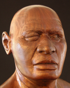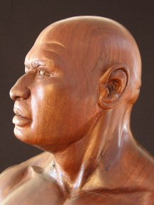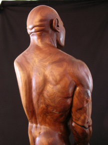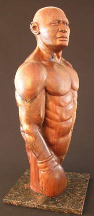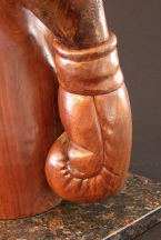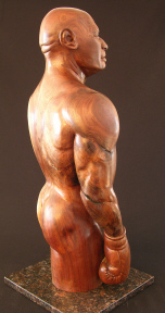 A large black walnut log was the perfect medium for posing a question. The dichotomy between the boxer's magnificent physique and the punishment inflicted upon it is striking. The question is "Does any athlete win in the sport of boxing?" |